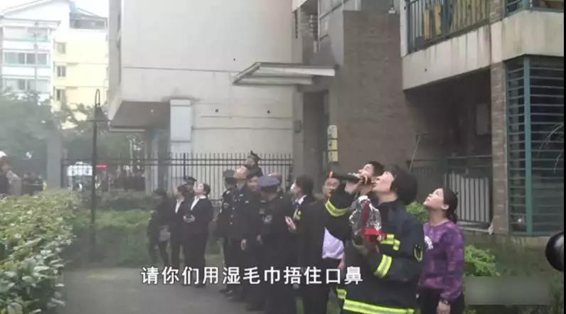 消防員擔(dān)心被困居民因火災(zāi)濃煙而產(chǎn)生恐慌情緒和引發(fā)中毒現(xiàn)象,立即通過喊話器向起火樓棟中的居民呼喊:“樓上居民請注意,樓上居民請注意!請你們用濕毛巾捂住口鼻,把門窗關(guān)好,把門窗關(guān)好,明火已經(jīng)滅了,火燒不到家里的,請不要驚慌,請不要驚慌……”,以此引導(dǎo)居民預(yù)防濃煙中毒,并請居民耐心等待救援。